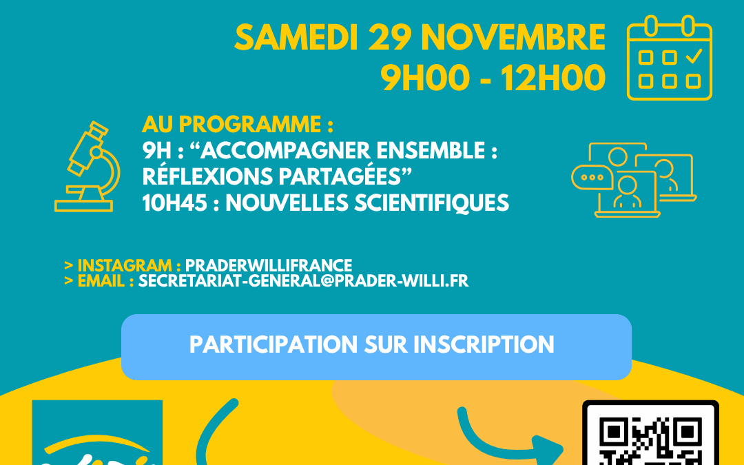 Ce samedi 29 novembre 2025 de 9h à 12h, Prader-Willi France organise un webinaire avec deux sujets :